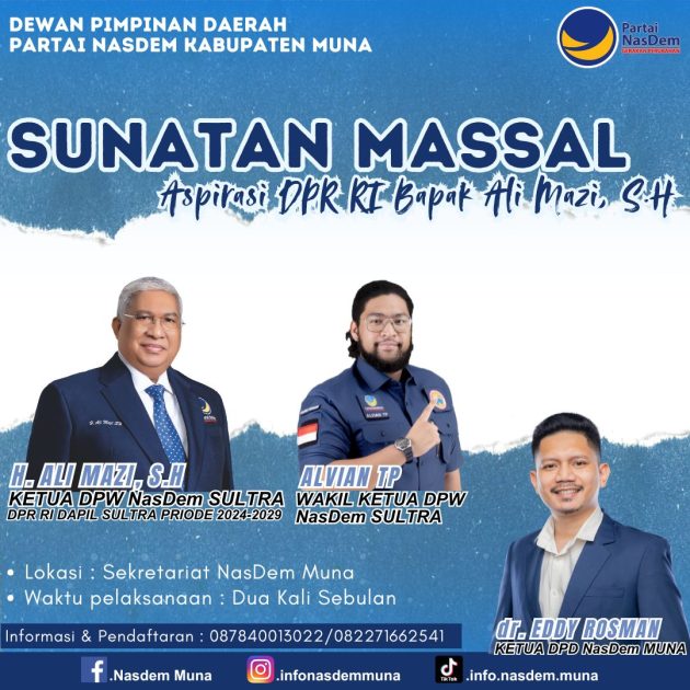 Selain “Rumah Aspirasi Fungsional”, Ali Mazi juga menggandeng DPD Partai NasDem Muna mencanangkan kegiatan sunatan massal gratis. Pesertanya tidak terbatas dan setiap bulannya akan berlangsung sekali, atau bahkan dua kali.